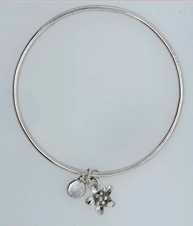Flower and nugget charm sterling silver bangle bracelet